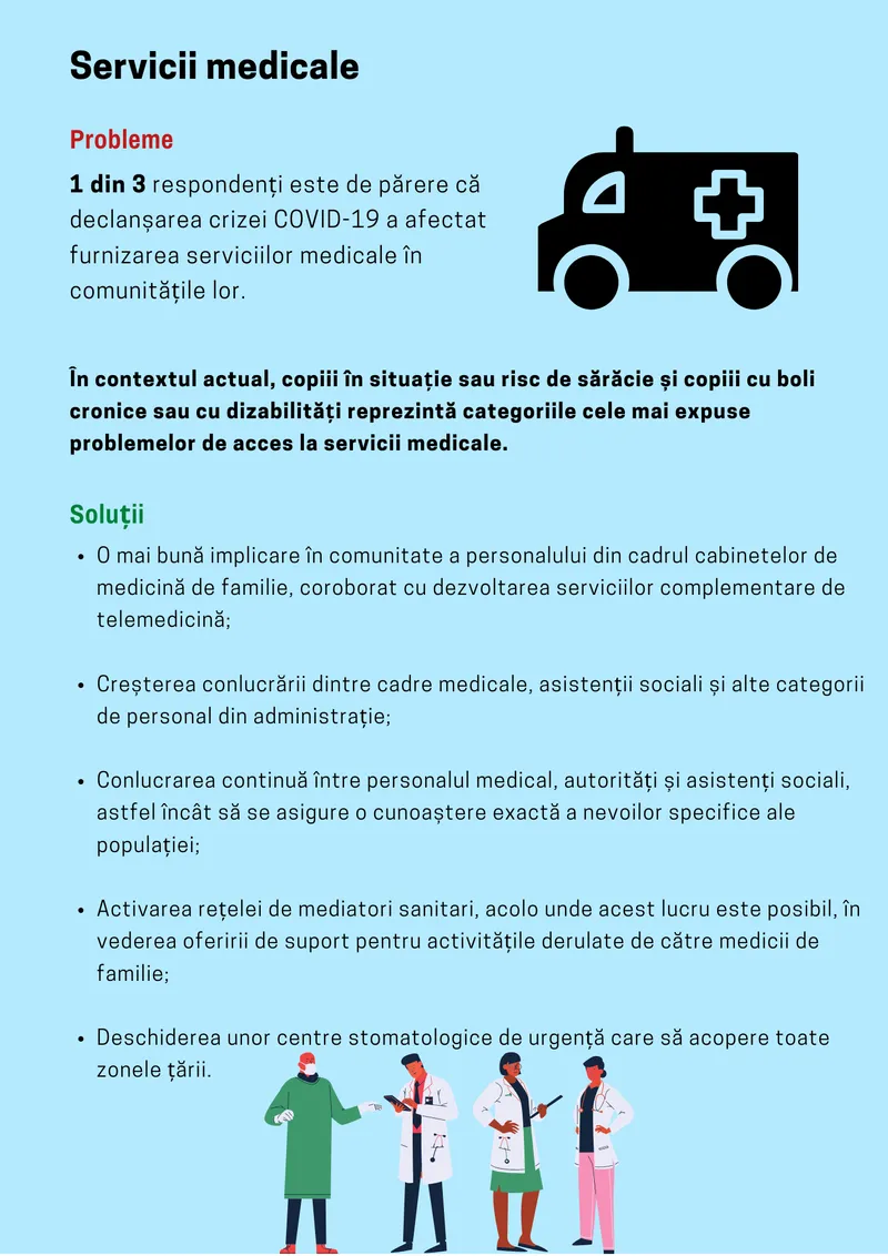 Pentru copiii și familiile cu copiii din aceste comunități, dar și pentru celelalte categorii de populație, reducerea activităților directe ale medicilor de familie, prin ajustarea programului de lucru de la cabinete și anularea vizitelor în teren, poate avea consecințe severe, greu de estimat în acest moment, mai cu seamă dacă luăm în calcul posibilitatea de prelungire a crizei medicale ce caracterizează perioada actuală”, se arată în analiza citată.