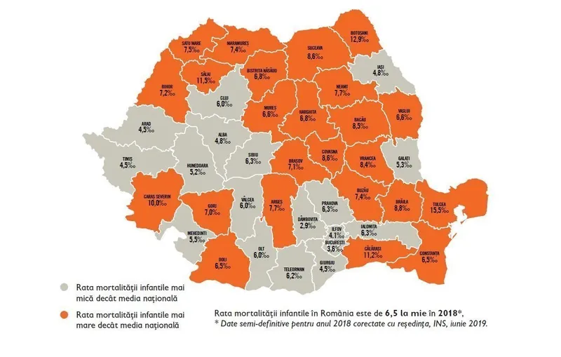 Cele mai mari rate ale mortalității infantile sunt: Tulcea (15,5 la mie), Botoșani (12, 9 la mie), Sălaj (11,5 la mie), Călărași (11,2 la mie) și Caraș-Severin (10 la mie). Cele mai scăzute rate ale mortalității infantile se înregistrează în Dîmbovița (2,9 la mie), Ilfov (4,1 la mie), Rad și T8miș (4,5 la mie), Iași și Alba (4,8 la mie) și București (3,6 la mie).