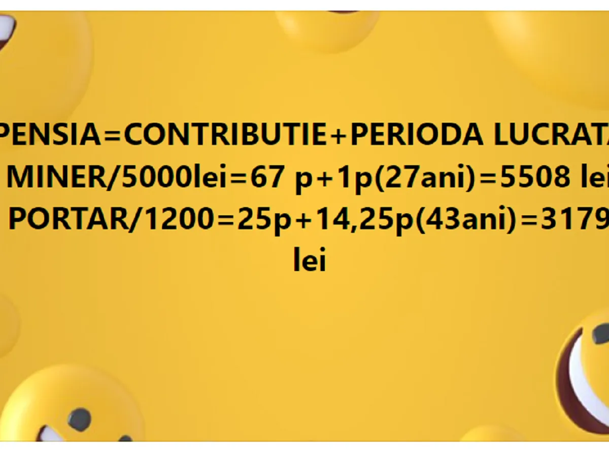Pensia minerului: 67 puncte + 1 punct = 68 de puncte X 81 = 5.500 lei brut. Se aplică 10% impozit pe ceea ce depășește 2.000 lei, adică 350 lei impozit.