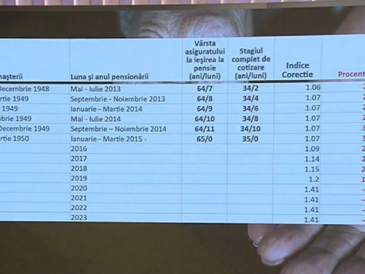 Mai jos câteva slide-uri în care vedeți luna și anul nașterii pensionarului, apoi coloana a doua spune luna și anul pensionării, vârsta la care a ieșit la pensie și procentul de creștere al pensiei (cu roșu).