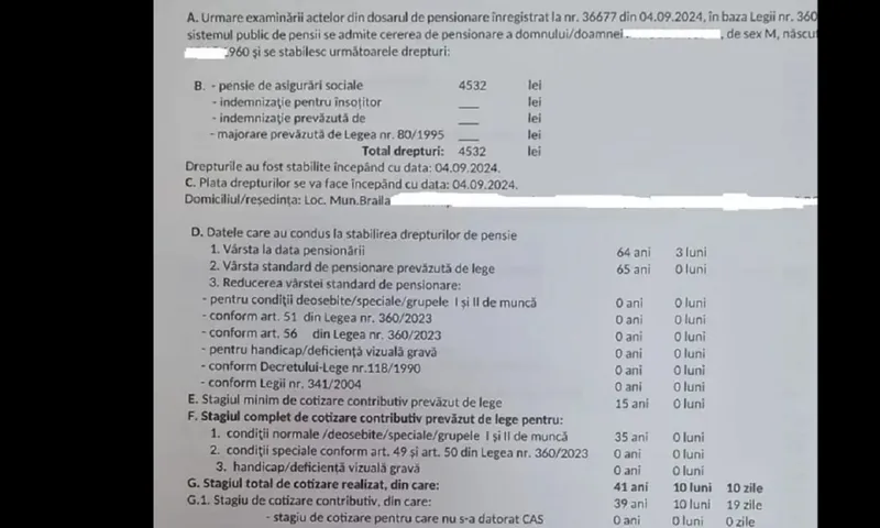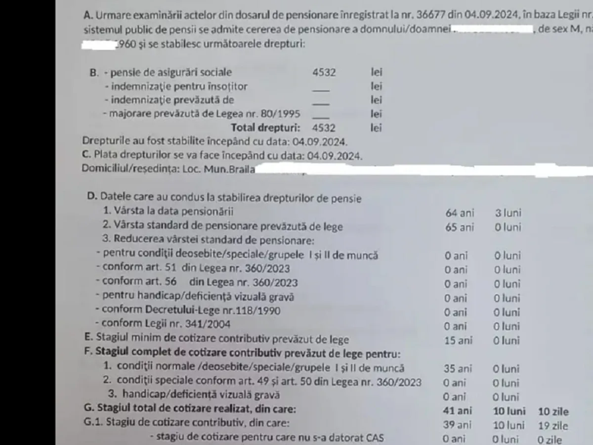 Mai jos aveți o decizie emisă pentru un dosar depus la început de septembrie. Dosarul a fost depus în data de 4 septembrie și pensia este de 4.532 de lei.