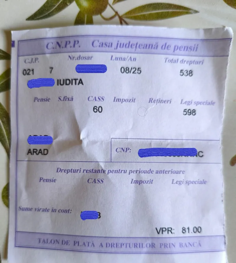 Pensia primită pe luna august este mult mai mică decât pragul de 3.000 de lei. Este o pensionară din Arad care are o pensie de numai 598 de lei. I-a fost reținut un CASS de 10% din pensie, adică suma de 60 de lei.