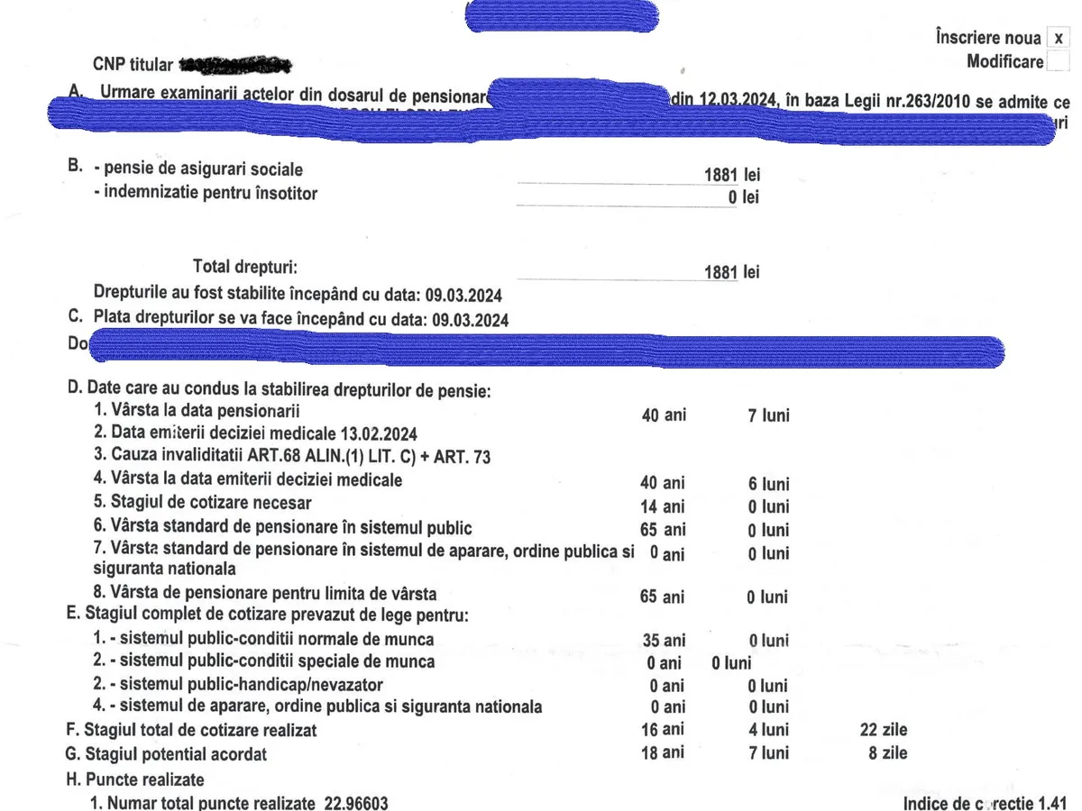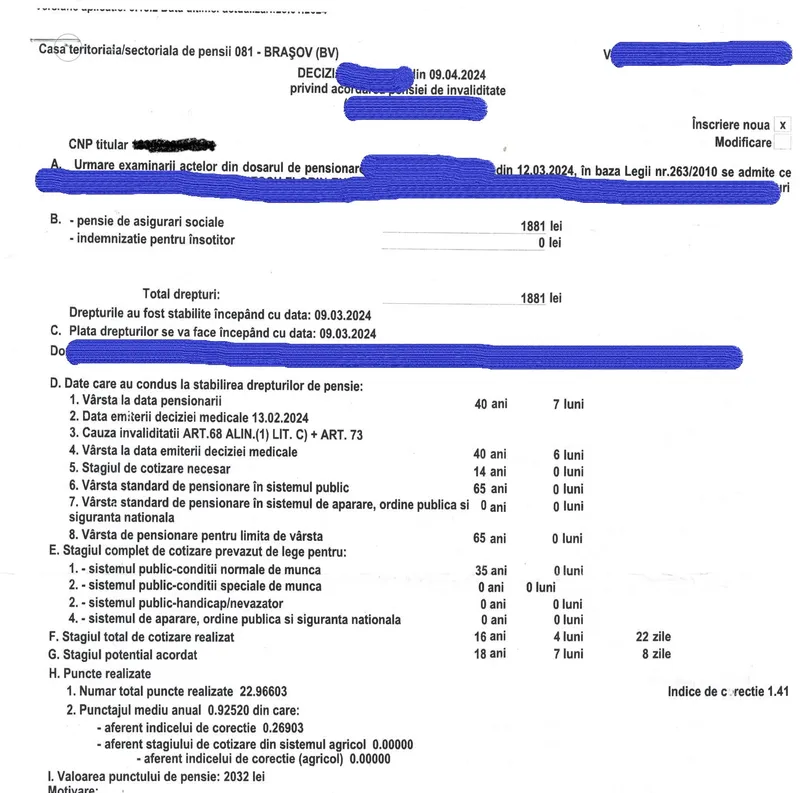 Mai exact, la data de 9 aprilie 2024, Casa Județeană de Pensii a emis o decizie prin care i-a fost stabilită o pensie de invaliditate în cuantum de 1881 lei, în baza Legii 263/2010. Această sumă a fost calculată pe baza unui stagiu total de cotizare (realizat și potențial) de 35 de ani și un punctaj total de 22.96603 puncte.