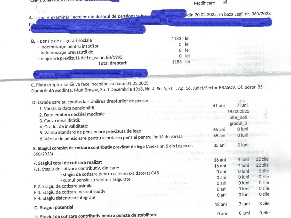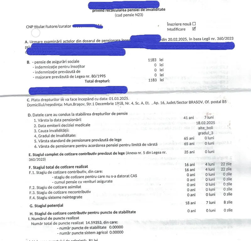 În iulie 2025, printr-o nouă decizie emisă de aceeași instituție, pensia a fost recalculată conform noii Legi 360/2023, în contextul scăderii gradului de invaliditate de la gradul II la gradul III.