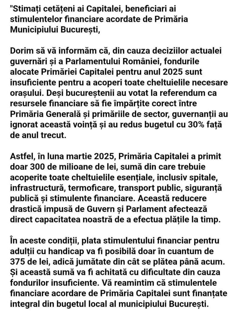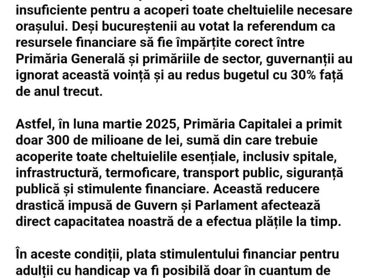 Primăria București spune că a primit de la guvern, în luna martie, o sumă foarte mică de numai 300.000.000 de lei. În acest contex, primăria nu are bani să plătească integral stimulentul de inserție de 750 de lei pentru persoanele cu dizabilități.