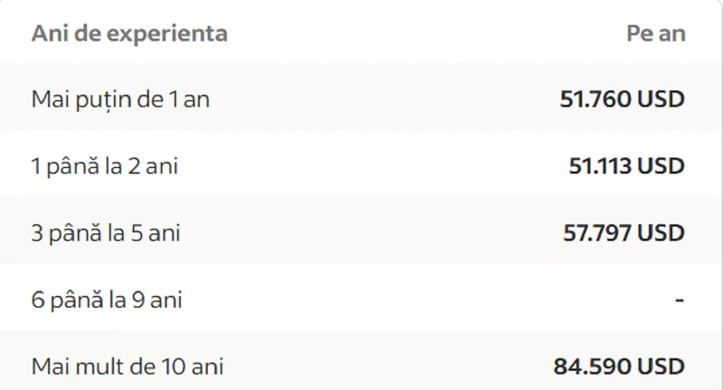 Plata suplimentară ar putea include bonusuri în numerar, comision, bacșișuri și împărțirea profitului. „Intervalul cel mai probabil” reprezintă valorile care există în percentilele 25 și 75 din toate datele de plată disponibile pentru acest rol.