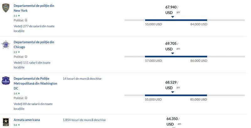 Cum vi se pare 63.000 USD pe an? Acesta este salariul unui ofițer de poliție în SUA. La această sumă se adaugă și alte sporuri în valoare de câteva mii de dolari anual. În România, un polițist primește câteva mii de lei lunar.