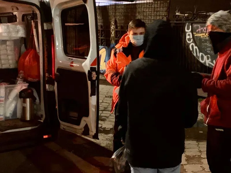 Carusel este un ONG din Capitală care ajută oamenii fără adăpost din 2011. Mașina organizației ajunge la Unirii la 9 fără câteva minute. Oamenii se adună la semafor și se ceartă pe ordinea în care vor merge la mașină. Cele două voluntare le dau oamenilor ceai cald și măști de protecție, iar asistentul social Zamfi Pînzariu îi întreabă dacă au nevoie de vreo pastilă de măsea, ce le face un picior plin de răni, cum o duc cei dragi.