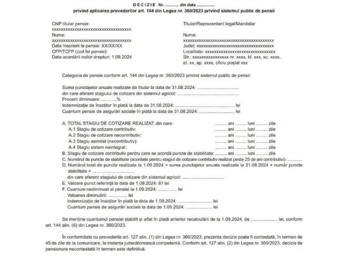 Decizia arată exact ca mai jos și conține informații despre pensia pe care pensionarul o va lua din septembrie.