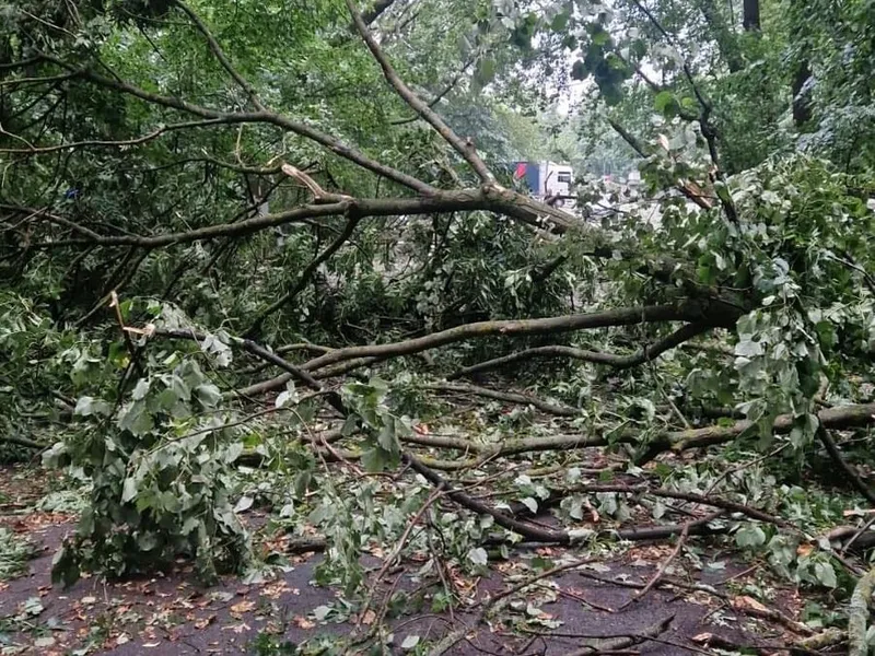 Un cartier din Capitală, Greenfield, este complet blocat de copacii căzuţi pe singura cale de acces, în urma furtunii de la începutul serii.