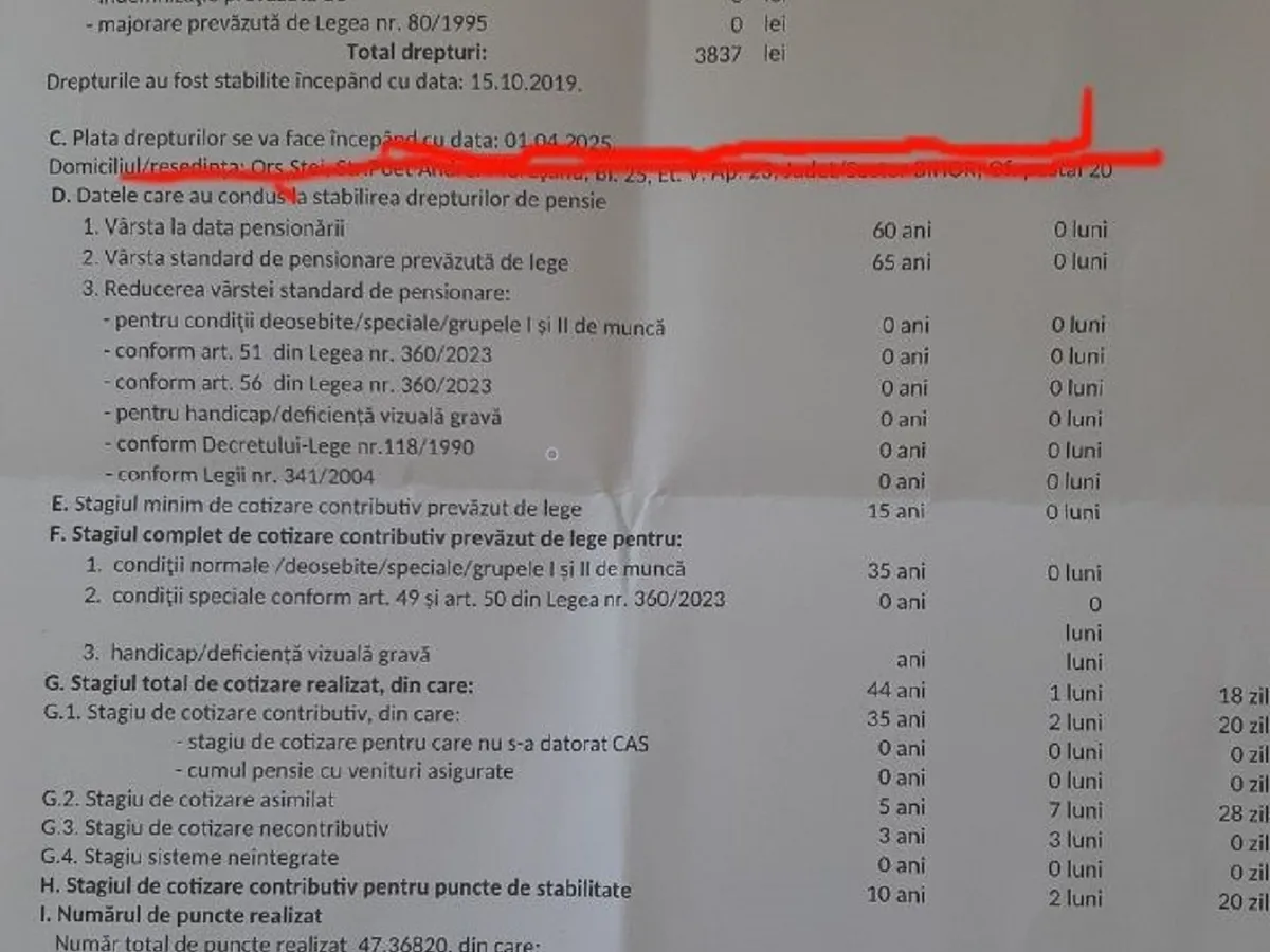 Pensionarul beneficiază de pensie de asigurări sociale încă din 15 octombrie 2019, însă recalcularea prezentă a fost necesară pentru valorificarea unor venituri brute suplimentare obținute în timpul activității profesionale, conform adeverințelor depuse de fostele locuri de muncă.