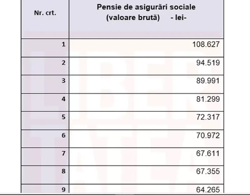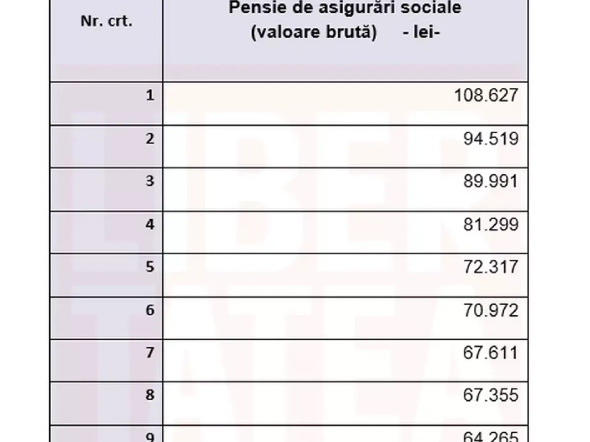 Cea mai mare pensie încasată în România exclusiv în baza contributivității este de 108.627 de lei (valoare brută). Mai jos topul pensiilor contributive.