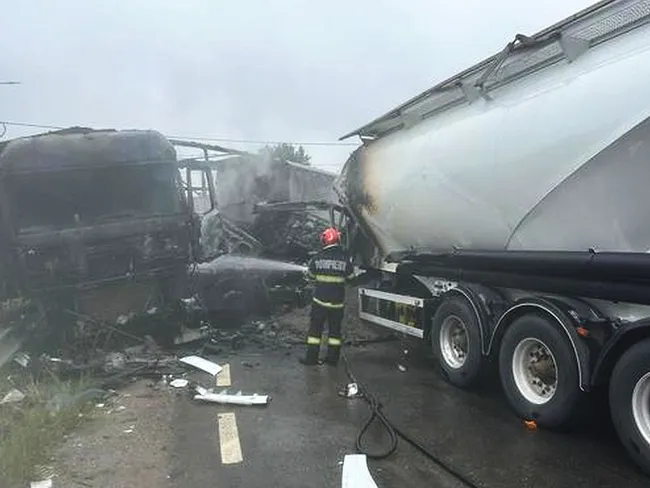 ”Din fericire, atât şoferul autocamionului, care transporta tuburi de metal, cât şi cel al autocisternei încărcate cu praf de beton, reuşiseră să se autoevacueze din cabine, înainte ca acestea să fie cuprinse de flăcări.