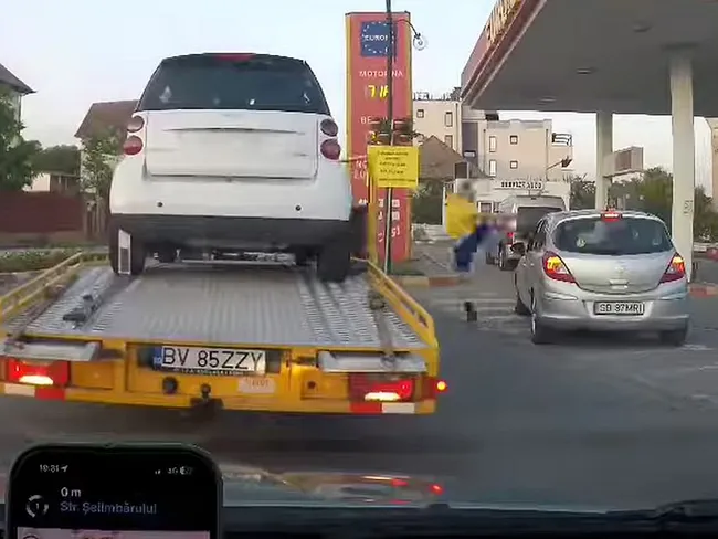 Imaginile au fost surprinse în localitatea Cisnădie, din județul Sibiu. Se observă clar cum șoferul, un agent de poliție, se oprește brusc în mijlocul drumului.