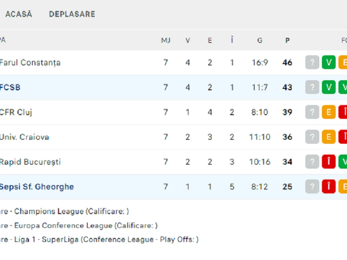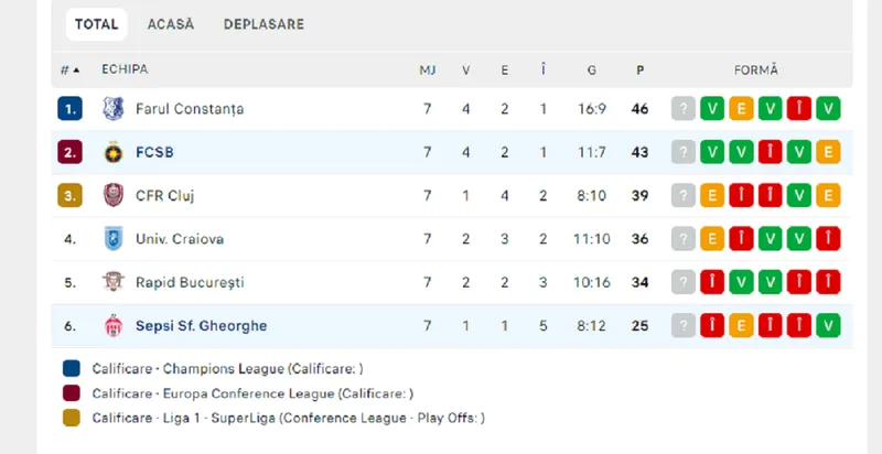 Dacă se va impune U Cluj în finala Cupei, locul 3 din clasamentul de mai sus intră în preliminariile Conference League, iar a patra joacă barajul pentru Europa cu echipa care câștigă grupa de play-out. U Cluj nu are drept să joace în Europa.