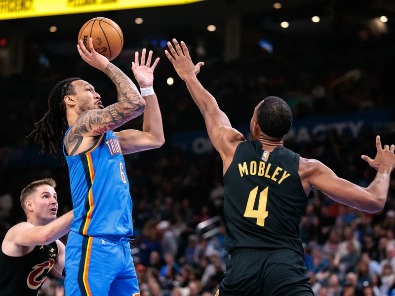 Oklahoma City Thunder, campioana en titre a NBA, a întrerupt seria de şapte victorii a lui Cleveland Cavaliers, impunându-se duminică pe propriul teren, cu 121-113, în liga profesionistă nord-americană de baschet, graţie unui număr mare de coşuri înscrise de la mare distanţă.