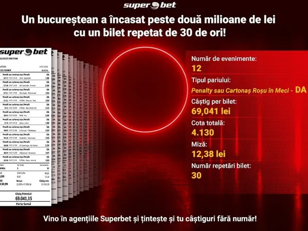 Ziua de duminică a fost de pomină pentru un parior Superbet din cartierul Titan al Bucureștiului. Cu fler, inspirație și un gram de noroc, jucătorul a dat o lovitură cu adevărat de titan! Acesta a creat un bilet cu 12 evenimente, toate pronosticate la fel: Penalty sau Cartonaș Roșu în Meci - DA!