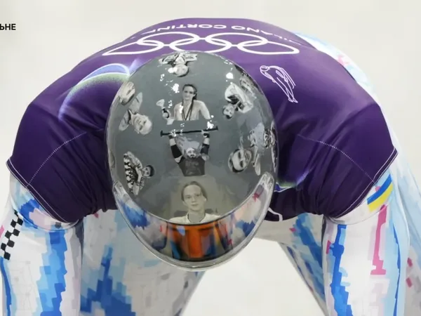 Vladyslav Heraskevych at the 2026 Olympics wearing a helmet with photographs of Ukrainian athletes who had been killed by the russian war.