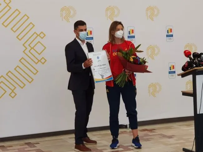 Primită în Salonul Oficial de la Henri Coandă cu flori și diplome de un alai în frunte cu ministrul Eduard Novak, sportiva medaliată cu argint la Tokyo nu l-a menajat pe șeful Sportului din România, taxând declarațiile făcute de acesta imediat după finala de la spadă.