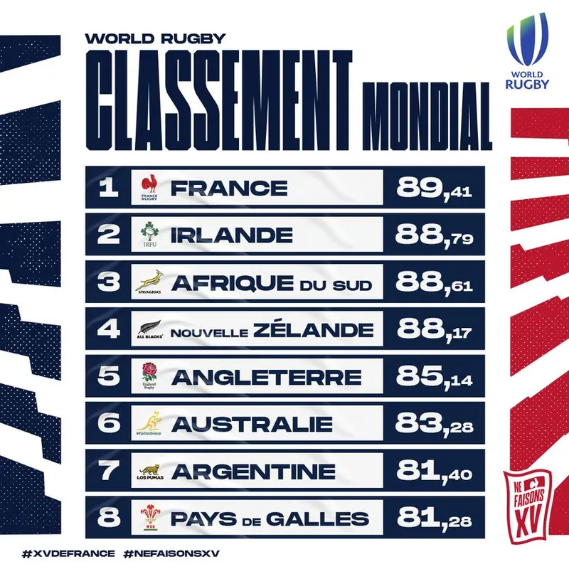 Pour la 1ère fois de son histoire, le XV de France atteint la 1ère place du classement mondial.