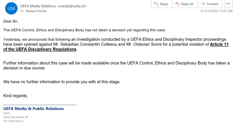 Ieri am anunțat că, în urma unei investigații efectuate de un inspector de etică și disciplină UEFA, au fost deschise procedurile împotriva domnului Sebastian Constantin Coltescu și a domnului Octavian Sovre pentru o posibilă încălcare a articolului 11 din Regulamentul disciplinar UEFA.