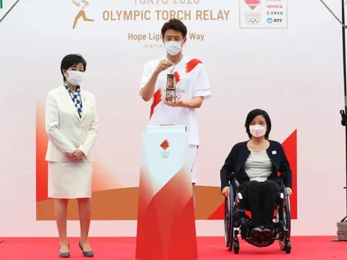 Exact cu două săptămâni înaintea ceremoniei de deschidere a Jocurilor, programată pentru 23 iulie, flacăra olimpică a fost purtată pe scenă într-un felinar şi predată simbolic guvernatoarei de Tokyo, Yuriko Koike.