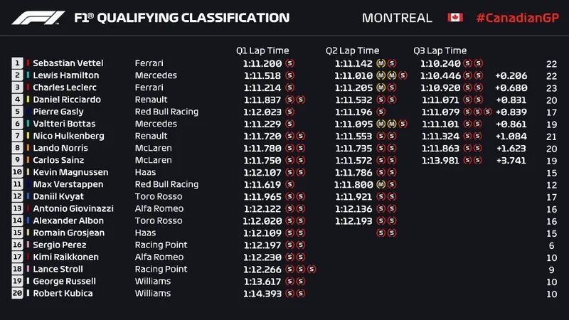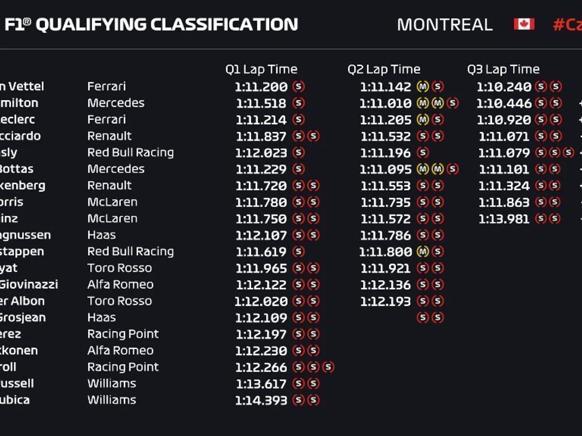 Sebastian Vettel a reușit primul Pole Position din acest sezon în Canada, devansându-l cu două zecimi de secundă pe Lewis Hamilton. În premieră în 2019, prima linie a grilei de start este împărțită de două echipe!