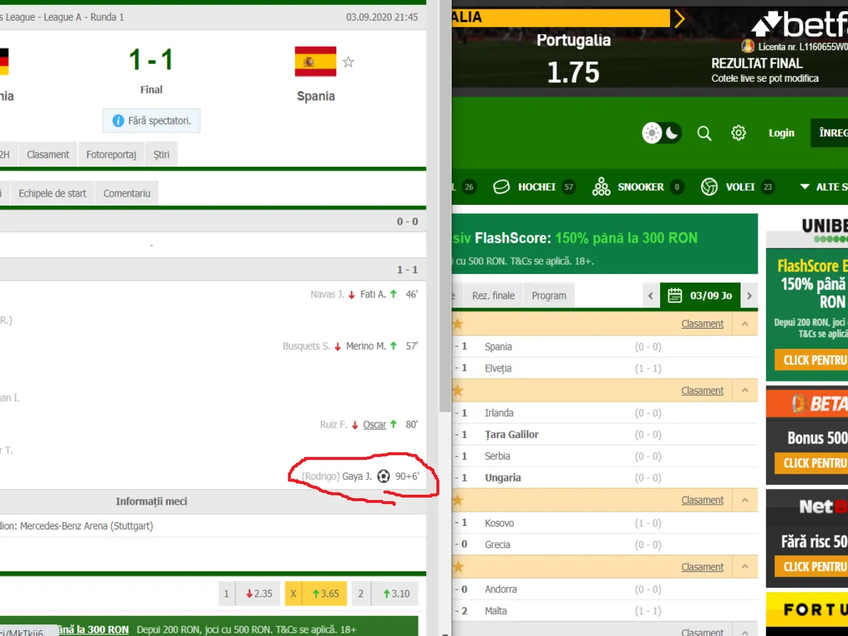 Pariorul mizase pe 1 (victoria la final a Germaniei), dar Spania a egalat în al șaselea minut de prelungire după cum se poate vedea mai jos.