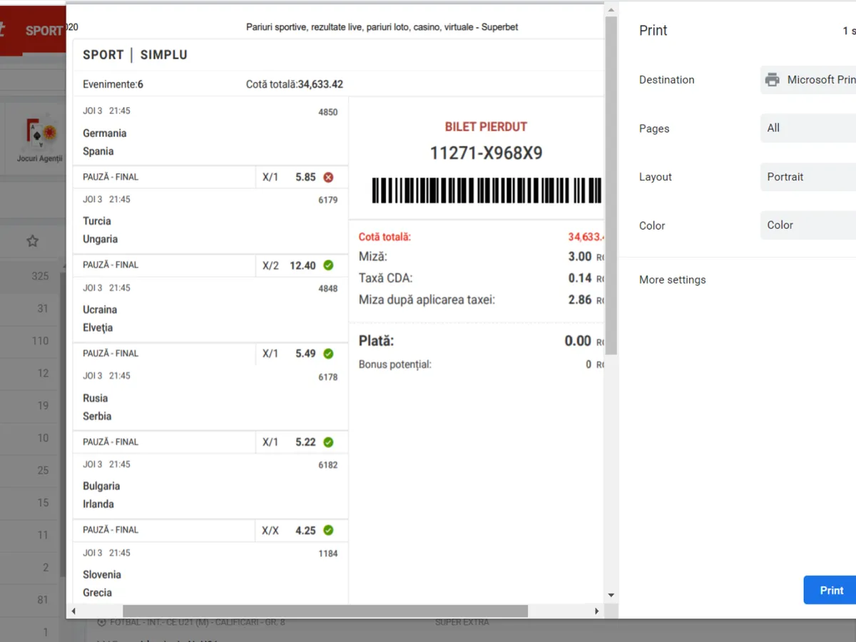 Pariorul, care a mizat doar 3 lei pe cele șase meciuri din Liga Națiunilor, a strâns o cotă de 34.633 și urma să câștige 99.051 lei (cum s-ar zice un milliard de lei vechi). Biletul este confirmat oficial la casa de pariuri după cum vedeți mai jos. Cu verde e confirmarea că respectivul meci pariat a fost corect intuit.