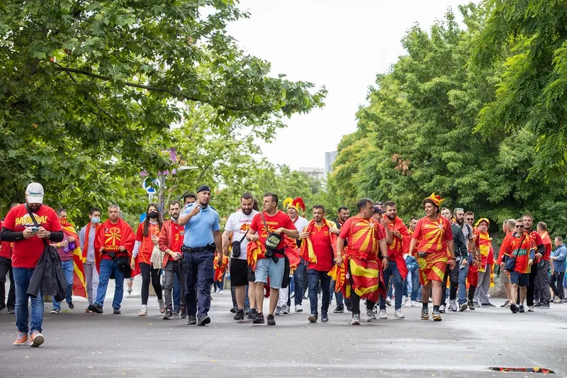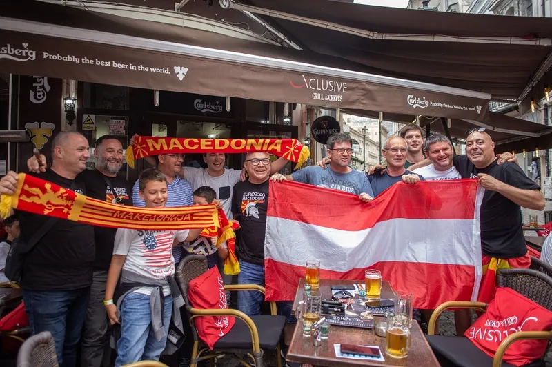 Suporterii veniți din Macedonia de Nord au părut mai înfocați, probabil și pentru că reprezentativa lor a ajuns în premieră la un turneu final, în timp ce austriecii n-au exagerat cu alcoolul și au stat în grupuri mai mici.