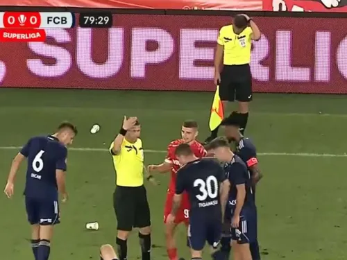 Arbitrul asistent de pe acea parte de teren, Mircea Orbuleț, și-a dus de îndată mâna la cap, gesturile lui reclamând faptul că paharul l-a lovit în zona capului.