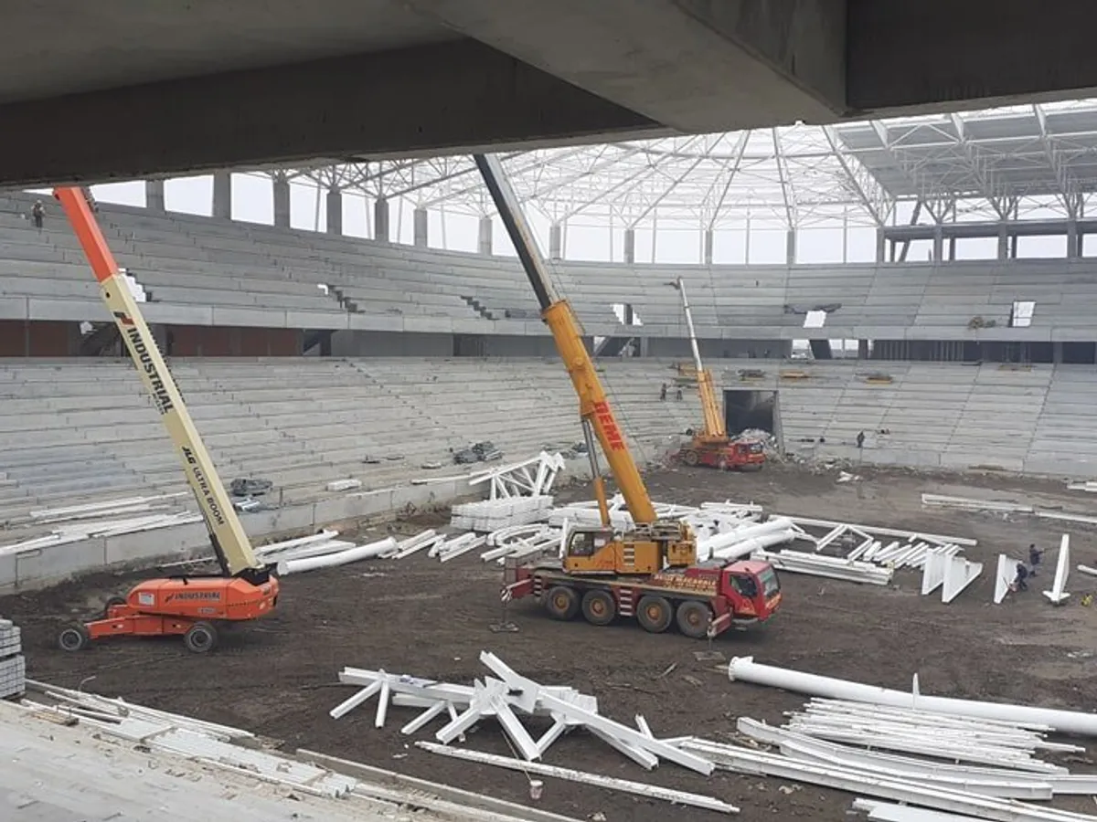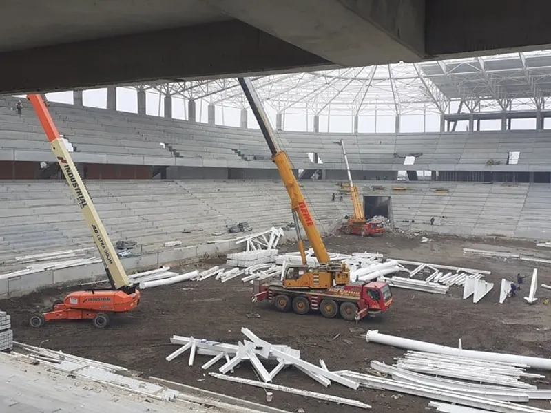 - S-au executat lucrările de infrastructură în proporție de 95%. Restul de 5% constituie goluri tehnologice necesare evacuării utilajelor mari din interiorul stadionului. Se execută lucrări la partea de suprastructura a stadionului, lucrări din beton monolit și prefabricate. Stadiul acestor lucrări este de cca.95%.
