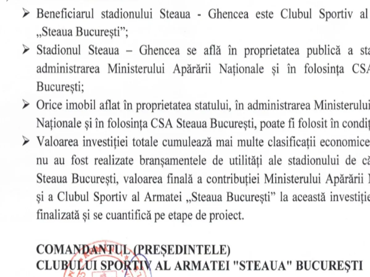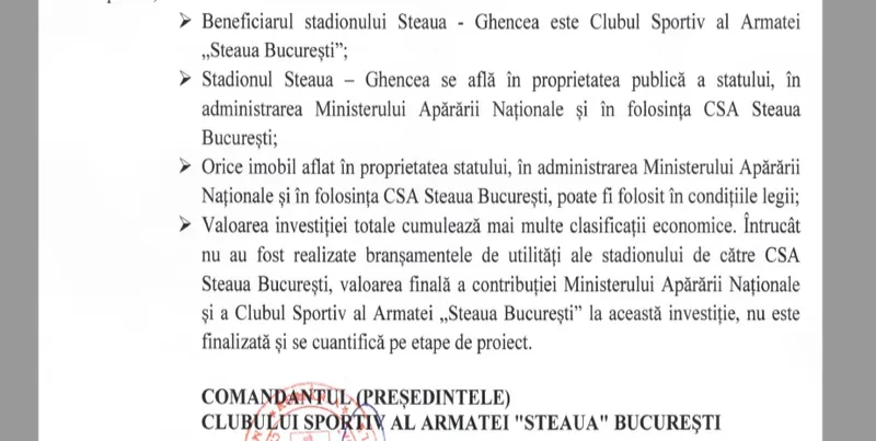 Întrucât nu s-au realizat branșamentele de utilități ale stadionului, valoarea finală a contribuției Ministerului Apărării Naționale și a Clubului Sportiv al Armatei Steaua la această investiție nu este finalizată și se cuantifică pe etape de proiect.”