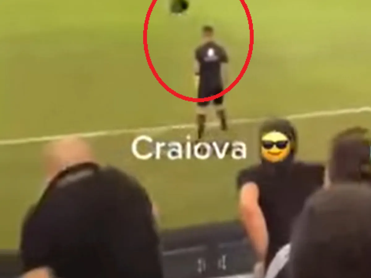 Un clip video publicat inițial pe Tik Tok și preluat de Oltenia TV arată cum un suporter de la Tribuna a II-a a stadionului din Craiova se descalță și aruncă cu unul dintre pantofi direct în arbitrul asistent Marius Badea, arată prosport.ro.