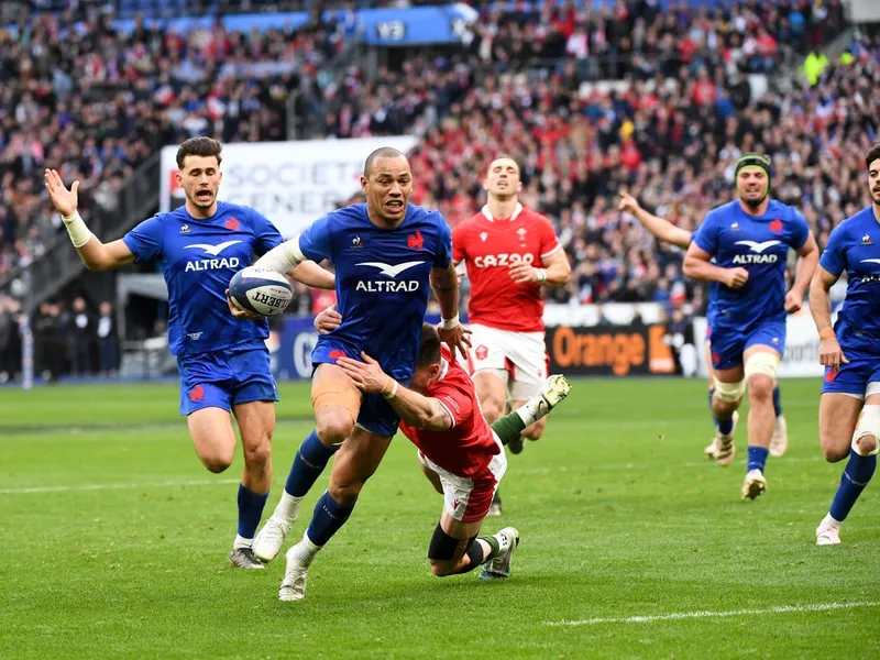 Damian Penaud este placat în timpul meciului internațional de rugby din Turneul celor Șase Națiuni dintre Franța și Țara Galilor - Foto: Profimedia Images