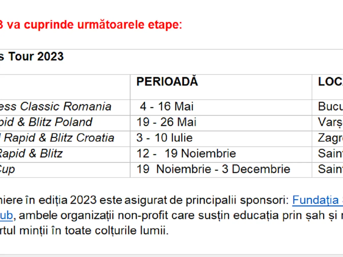 Formatul final și lista completă a jucătorilor din turneu și a wildcard-urilor vor fi anunțate în curând. Pentru mai multe detalii și pentru cele mai recente știri despre circuit, puteți vizita www.fundatiasuperbet.ro, www.superchess.ro, www.grandchesstour.org și urmări rețelele sociale ale Fundației Superbet și GCT.
