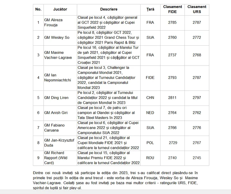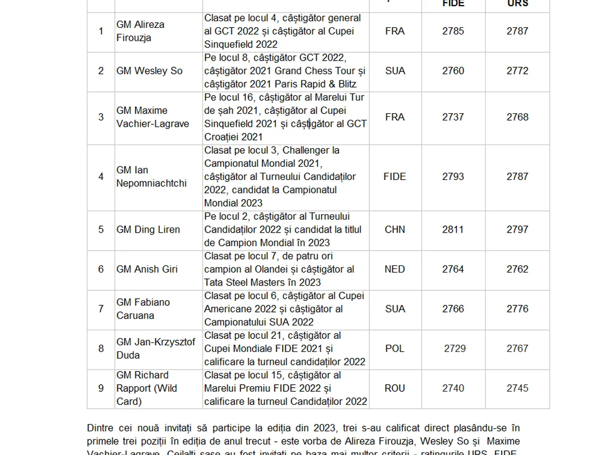 “Suntem mândri să anunțăm cel mai puternic line-up din istoria de opt ani a turneului, inclusiv pe campionul mondial din 2023, pe care-l vom afla în primăvara aceasta”, a declarat Directorul Executiv al Grand Chess Tour, Michael Khodarkovsky.