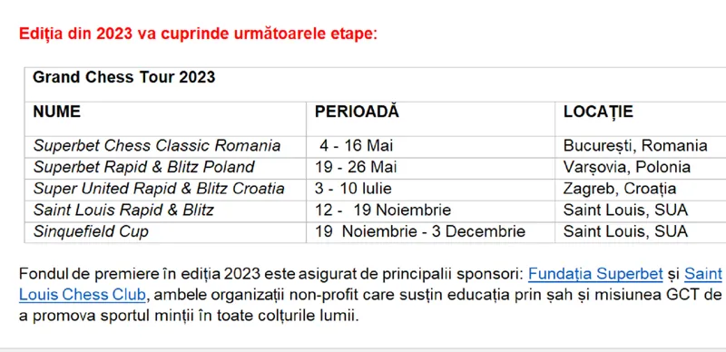 “Grație sponsorilor, Fundația Superbet și Saint Louis Chess Club, turneul GCT își continuă misiunea de a promova șahul în lume, aducând față în față cei mai buni șahiști ai lumii într-o competiție care îi va aduce câștigătorului unul dintre cele mai prestigioase titluri ale anului”, a completat acesta.