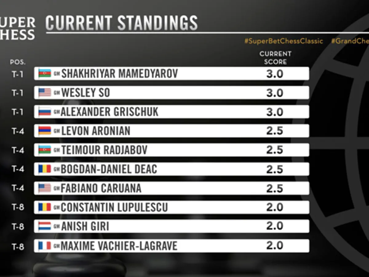 Trei jucători se află la egalitate în plutonul fruntaș, la finalul Rundei a V-a a Superbet Chess Classic Romania 2021, care s-a încheiat miercuri seara: Wesley So (SUA), Alexander Grischuk (Rusia) și Shakhriyar Mamedyarov (Azerbadjan).