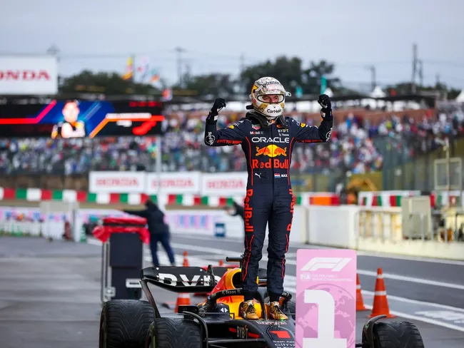 Max Verstappen a câștigat Marele Premiu al Japoniei 2022, după ce Charles Leclerc a fost penalizat cu trei poziții la finalul cursei confuzante pe ploaie, și, la 25 de ani, a devenit campion mondial pentru al doilea an consecutiv.