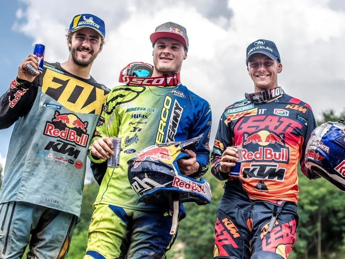 Wade Young (centru) a devenit cel mai tânăr câștigător din istoria Red Bull Romaniacs. Podiumul a fost completat de Manuel Lettenbichler (stânga) și Jonny Walker (dreapta).