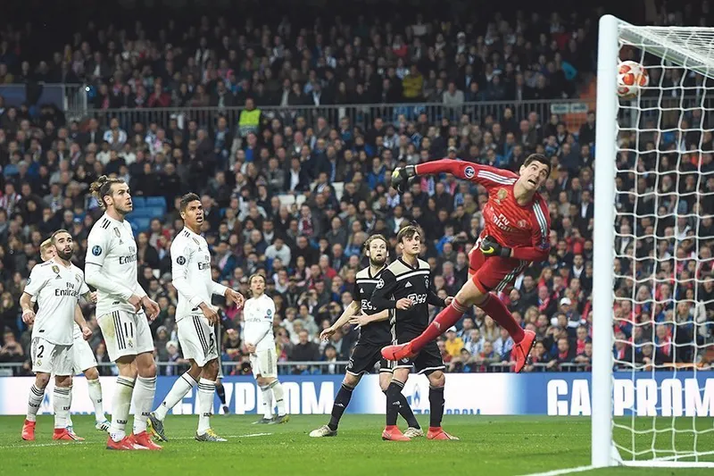 6 martie 2019 - Portarul Thibaut Courtois de la Real Madrid CF nu reușește să apere șutul plasat la vinclu de Lasse Schone. Era al patrulea gol încasat de Real, iar Ajax se califică în sferturile Cupei Campionilor Europeni.