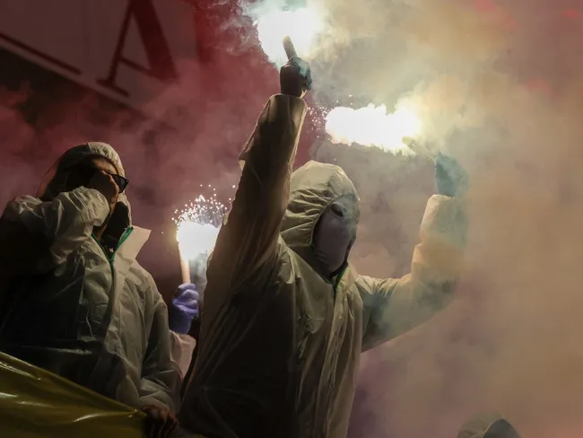 Mai mulţi şobolani morţi vopsiţi în roşu, culoarea predominantă a celor de la Standard, au aterizat într-o zonă a fanilor acestei echipe, aruncaţi din sectorul unde se aflau fanii oaspeţilor.