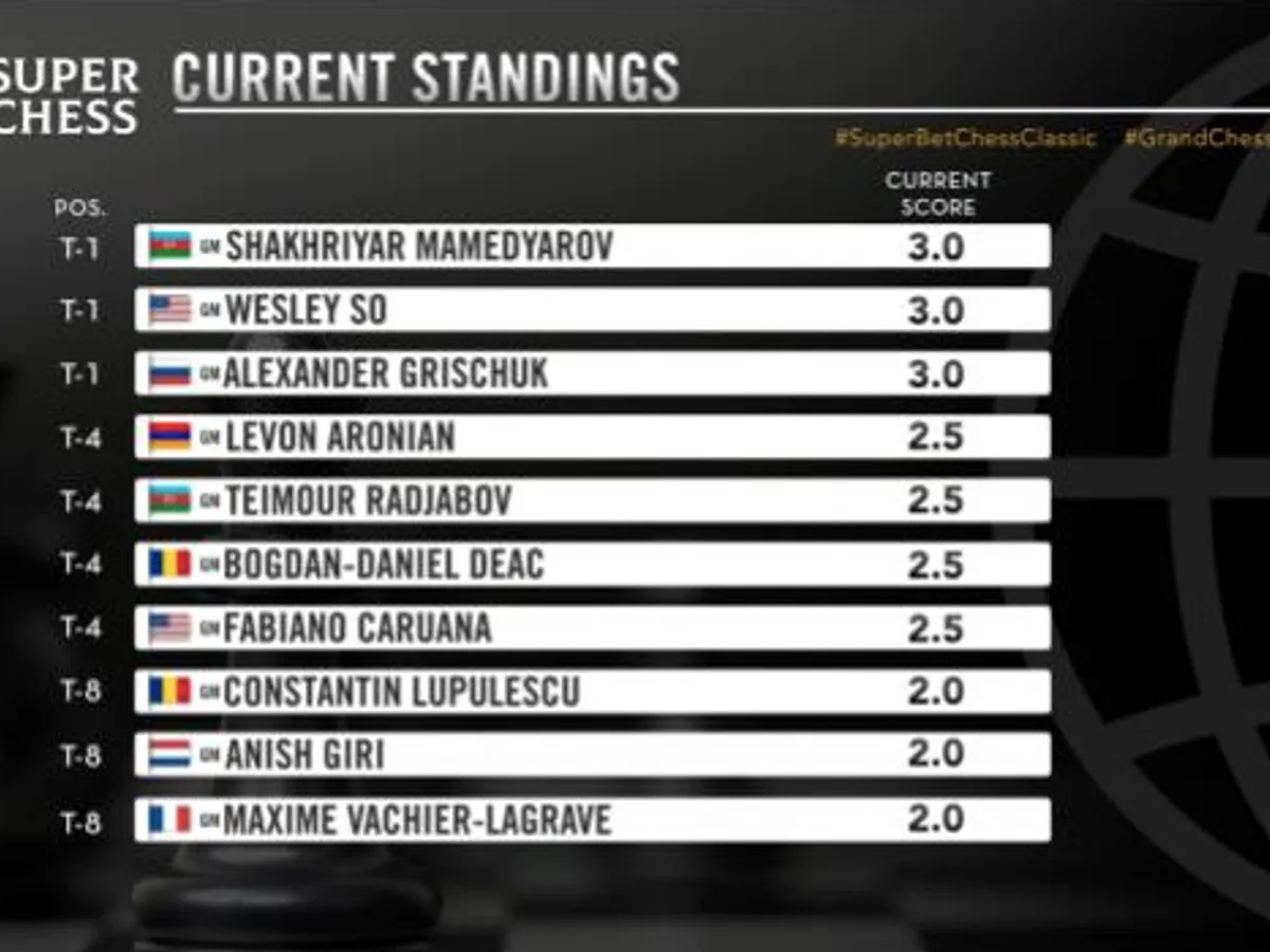 Trei jucători se află la egalitate în plutonul fruntaș, la finalul Rundei a V-a a Superbet Chess Classic Romania 2021, care s-a încheiat miercuri seara: Wesley So, Alexander Grischuk și Shakhriyar Mamedyarov. Jucătorul azer a intrat miercuri în topul clasamentului.