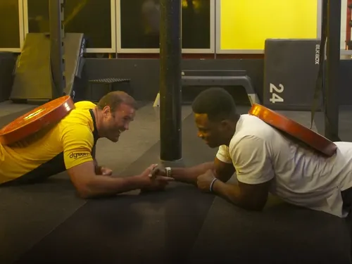 Jamie Roberts, fost component al echipei Țării Galilor și aL Leilor Britanici și Irlandezi și Samson Ebukam, jucător de fotbal american la Los Angeles Rams, NFL, și-au testat calitățile fizice într-o sală de sport.