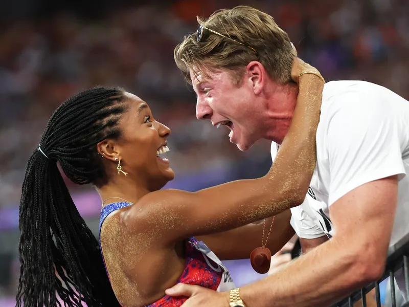 Historia de amor de película: Tara Davis-Woodhall es campeona olímpica. Ahora, su marido, Hunter Woodhall, también se consagró en @Paris2024. ❤️