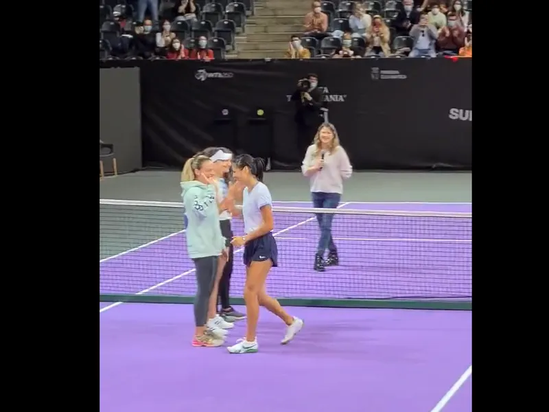 „Nu vorbesc în limba română foarte bine, dar pot să încerc. Vă mulțumesc foarte mult! Oamenii au fost foarte prietenoși cu mine și îmi lipsiți. Iubesc România!", a declarat Emma Răducanu, în fața fanilor adunați în tribunele arenei de la Cluj-Napoca.