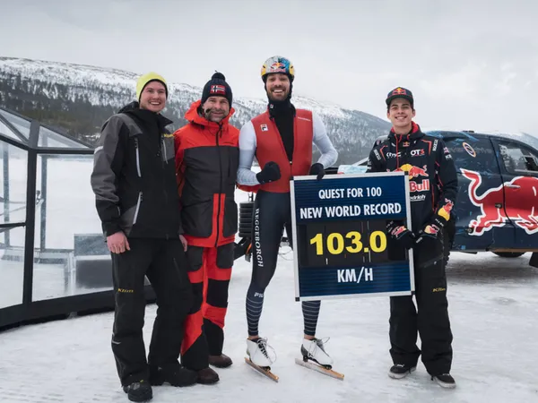 Olandezul în vârstă de 32 de ani a doborât recordul în condiții ideale: un patinoar natural cu o lungime de trei kilometri și o mașină de la Raliul Dakar în față, care i-a anulat forțele de frecare aerodinamice remorcând o construcție specială.