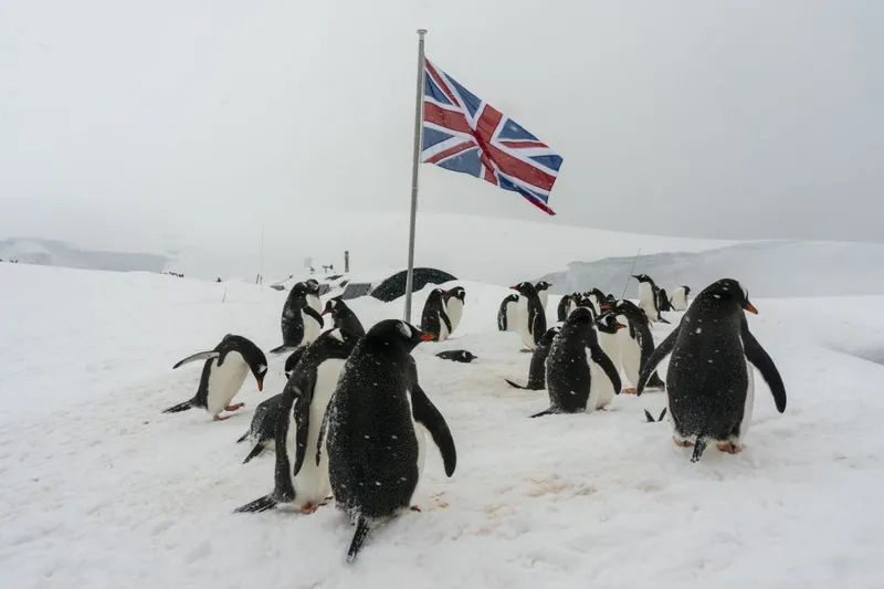 Pinguini Gentoo înconjoară un steag Union Jack al Marii Britanii, la Baza Port Lockroy, din Antarctica, pe Insula Wiencke - Foto: Profimedia Images