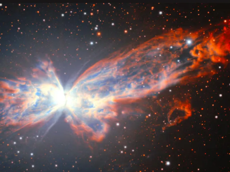 Fascinantul fenomen ceresc a fost ales de studenți în cadrul unui concurs aniversar. Telescopul de 8,1 metri de pe muntele Cerro Pachón, aflat la aproape 2.700 de metri înălțime, din centrul Chile, a surprins un spectacol uluitor, care seamănă cu un fluture strălucitor și colorat, cu aripile întinse.